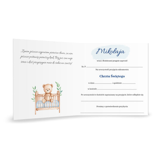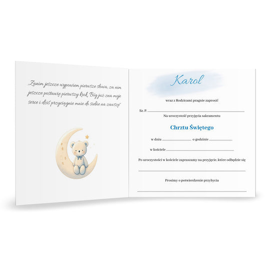 Zaproszenie na Chrzest składane 15x15 z kopertą - Pluszowy miś w niebieskiej muszcze