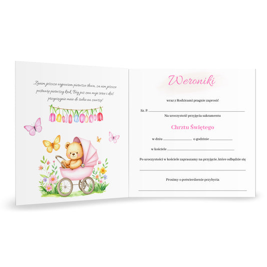 Zaproszenie składane z kopertą na Chrzest - Pluszowy miś i kolorowe motyle