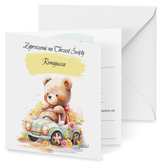 Zaproszenie składane z kopertą na Chrzest - Pluszowy miś w żółtym samochodzie