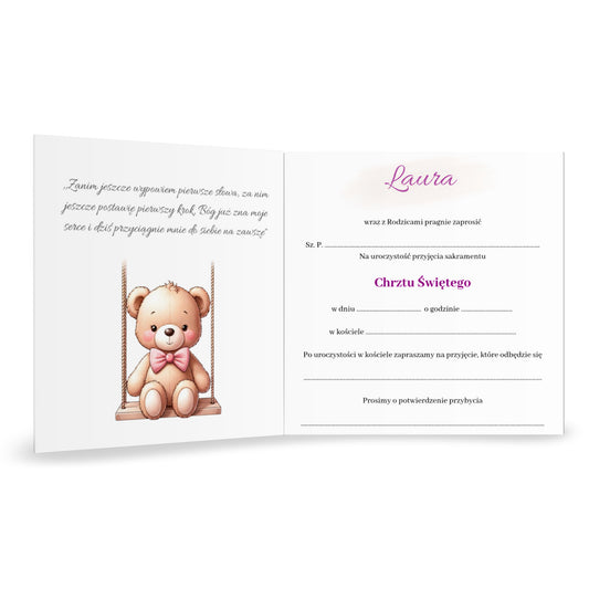 Zaproszenie na Chrzest składane 15x15 z kopertą - Pluszowy miś w różowej lokomotywie