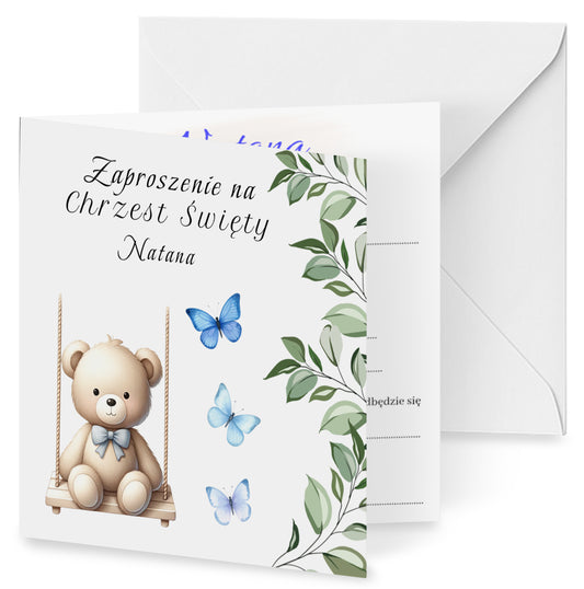 Zaproszenie składane z kopertą na Chrzest - Pluszowy miś i niebieskie motyle