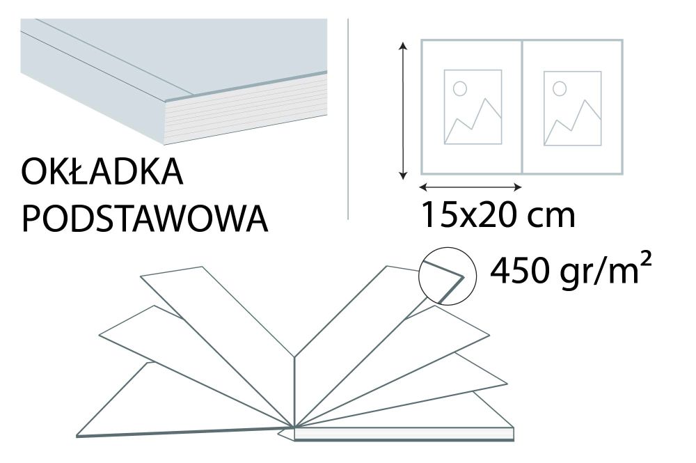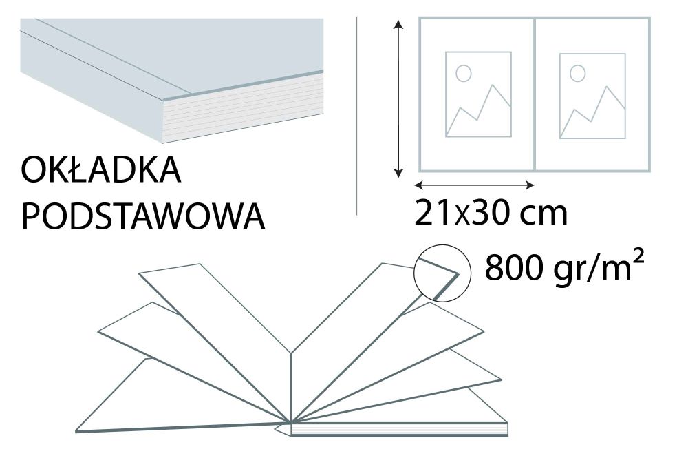 Okładka podstawowa o rozmiarze takim samym jak strony to ekonomiczne i praktyczne rozwiązanie dla osób ceniących sobie prostotę i estetykę. Nieco grubsza niż strony, zapewnia wytrzymałość na uszkodzenia mechaniczne.