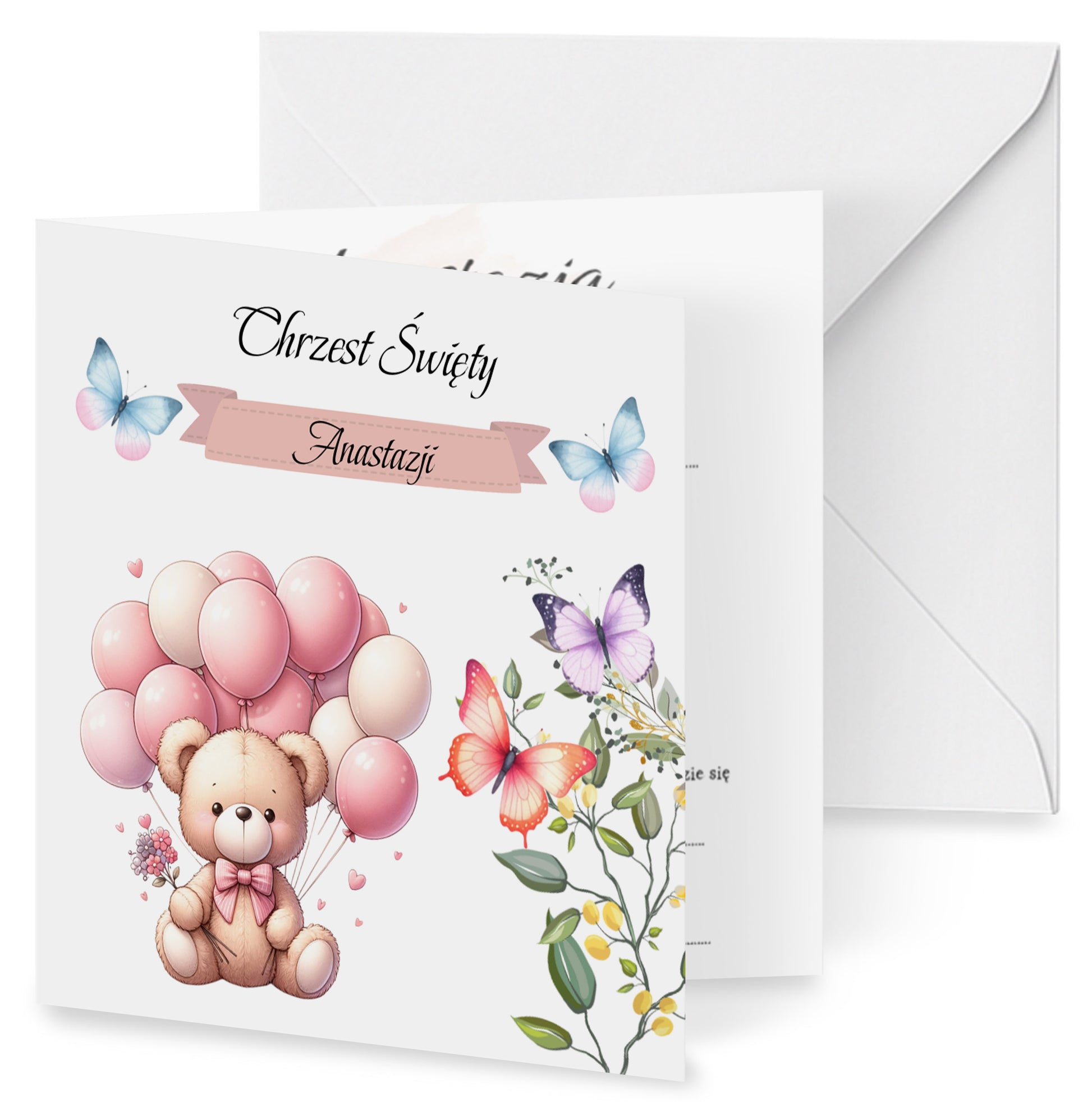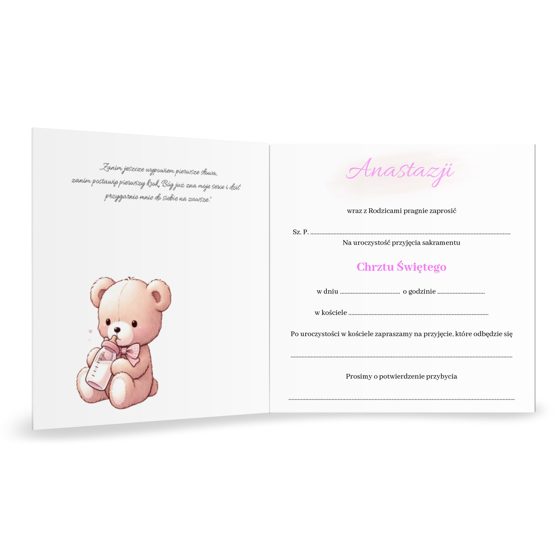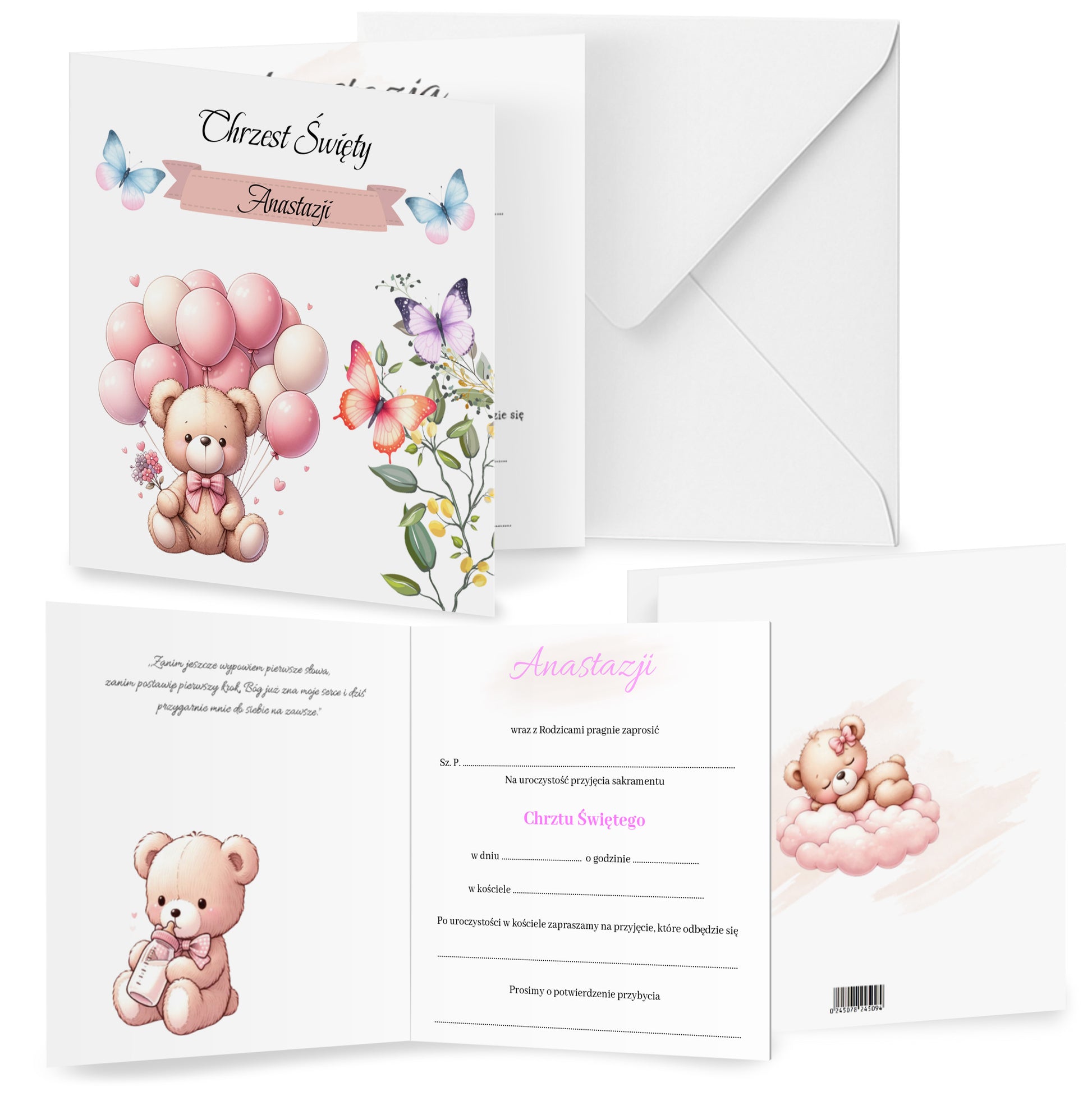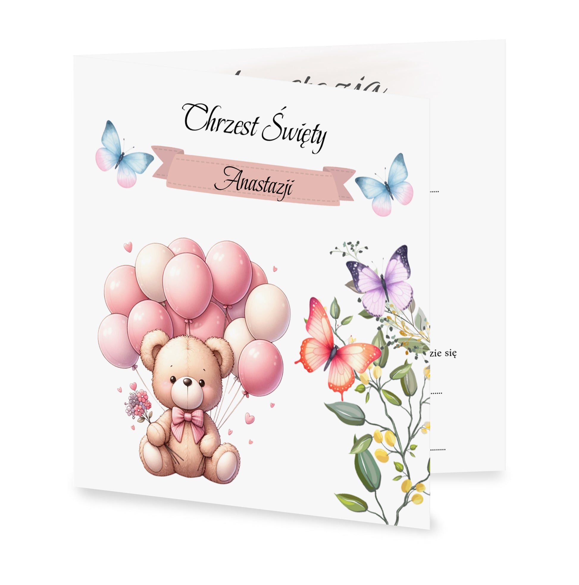 Zaproszenie składane z kopertą na Chrzest - Pluszowy miś z różowymi balonami