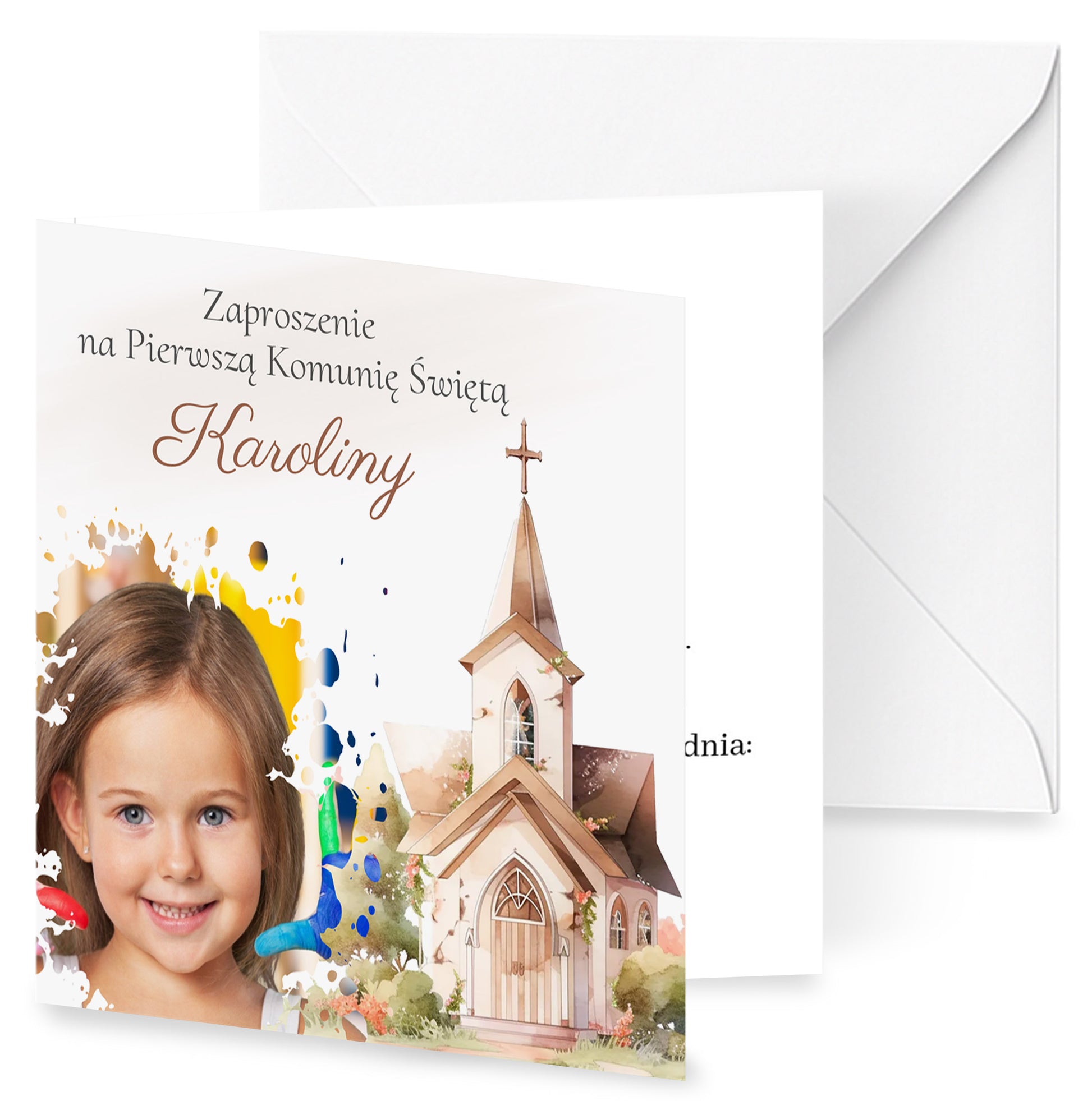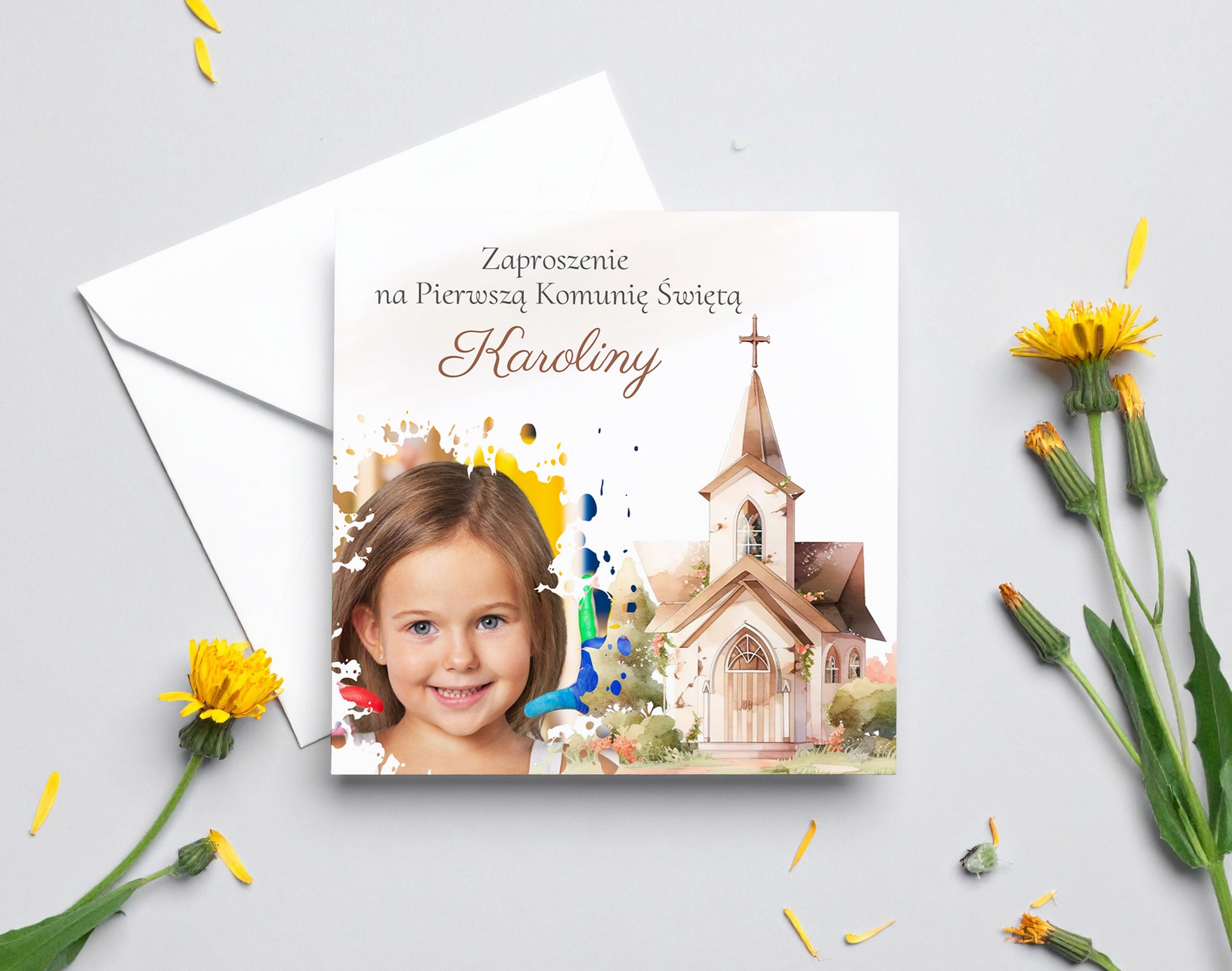 Zaproszenie na I Komunię Świętą – z kościołem + własne zdjęcie